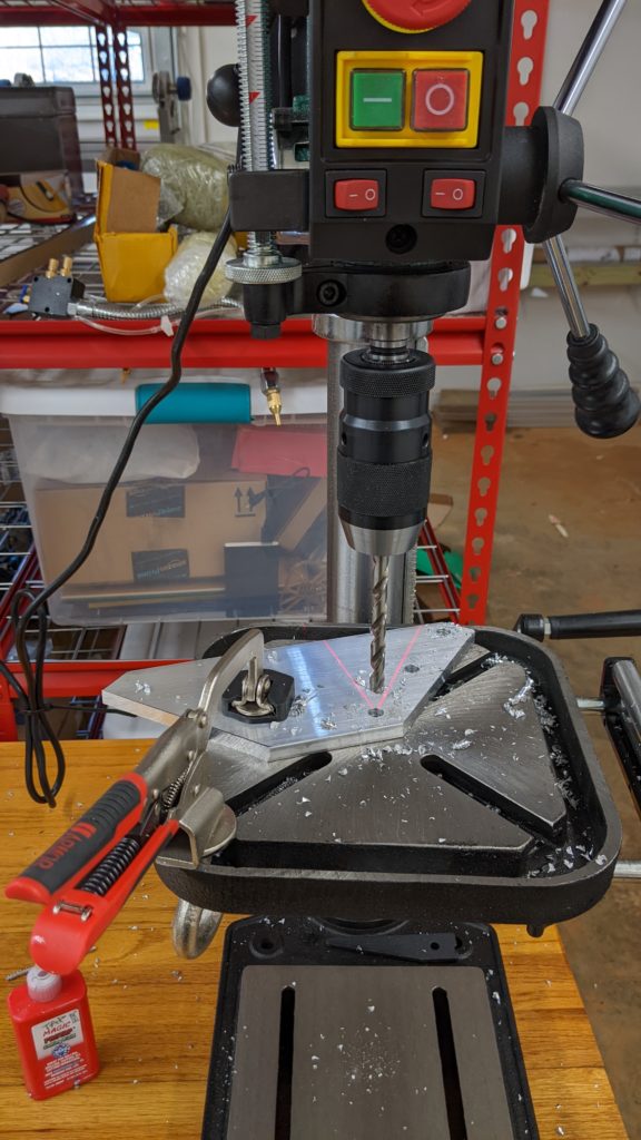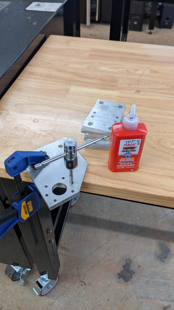 Consult the individual part drawings for each hole thread. Be sure to lubricate taps when threading and maintain perpendicularity as best as possible. For holes with a large aspect ratio (> 1:1) avoid power tapping with a hand drill and be sure to counter-rotate in order to break chips and clear the hole.