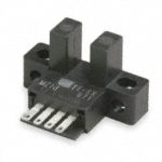 Another non-contact sensor that can be used as a limit switch is the photo-interrupter. These sensors work by having a (typically infrared) emitter on one side of a slot, and a receiver on the other. This type of sensor is meant to detect fast moving edges that pass through the emitter/detector pair with high repeatability.
