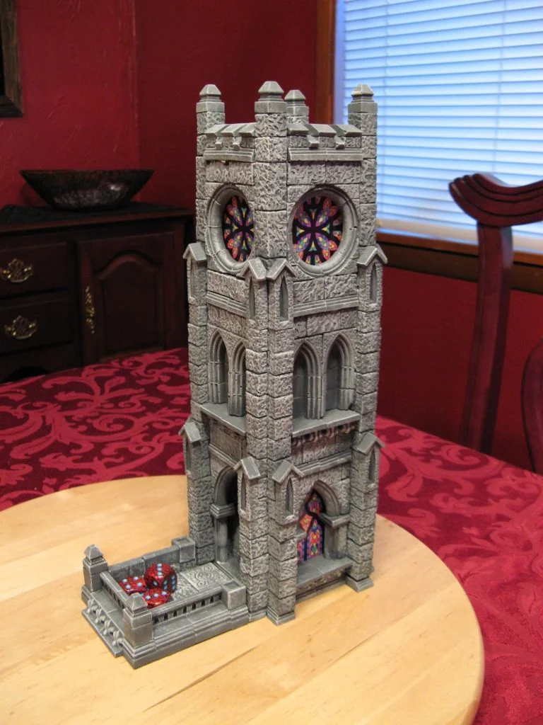 RPG dice are most commonly rolled by hand. Players often roll their dice into a tray instead of directly onto the table in order to contain the tumbling dice, preventing them from striking other components or rolling off the table entirely. Dice Towers are sometimes used by players instead of hand rolling because of the perceived increase in true randomness, aesthetic appeal, ease of use, and dramatic effect. Dice towers are simply a structure with internal baffles that the dice tumble through before exiting and coming to rest in a connected tray where the result can be read. They can be simple boxy structures or dramatic, thematic 3D sculptures.