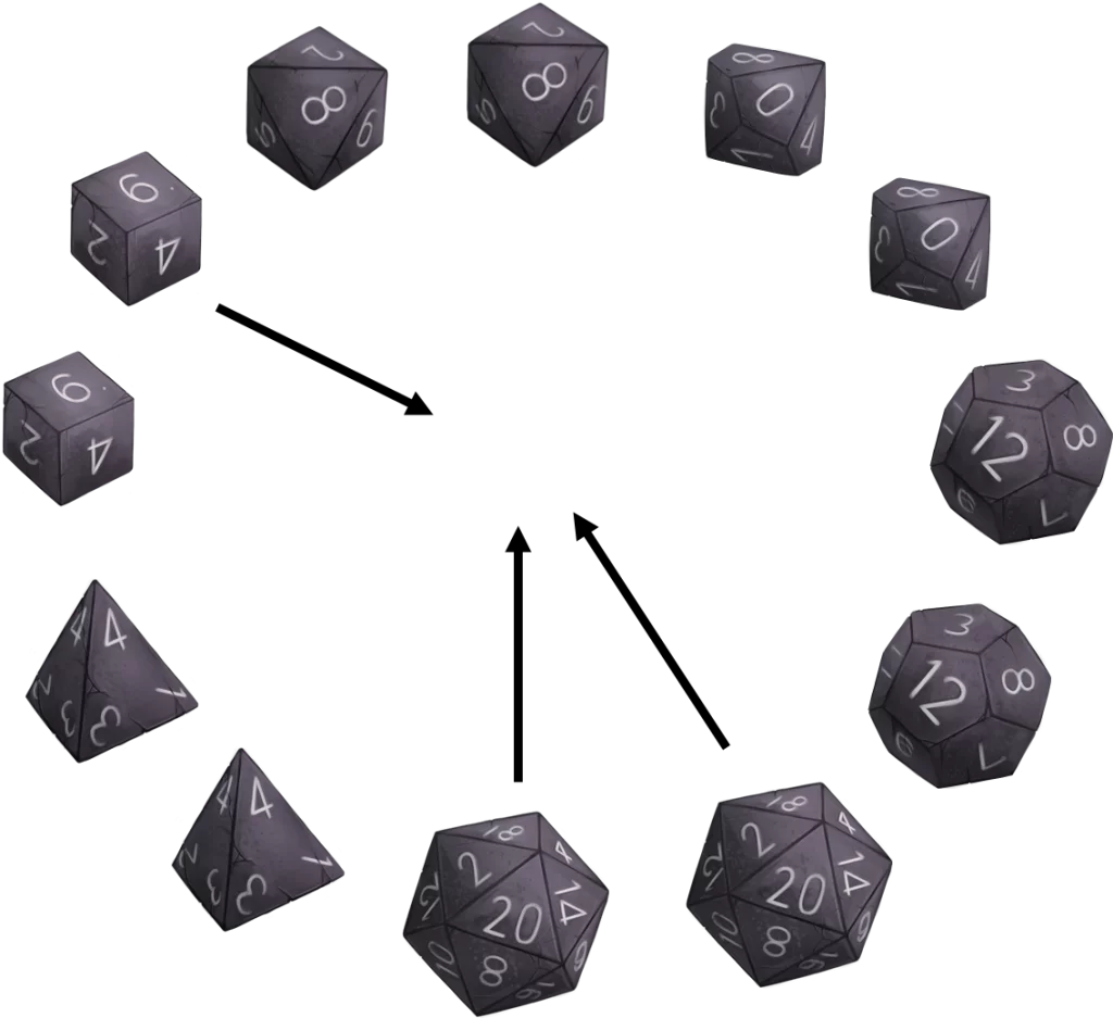 Many different types of dice are used beyond the standard 6-sided dice in order to provide the appropriate amount of possible deviation from an expected outcome. The most common dice have 4, 6, 8, 10, 12, and 20 sides (known as their “rank”) with larger rank dice generating a larger variance in outcome. There is standard notation for referring to each type of die (i.e. “d4” to represent a 4 sided die), or rolling specific groups of dice together (i.e. “2d4+1d8” to represent rolling two d4 dice and one d8 die then adding all of the values together).