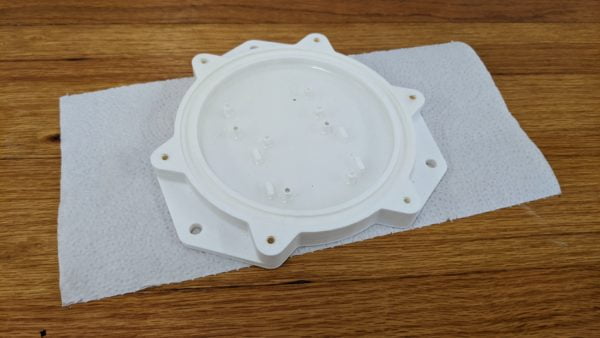 The first thing to test was how porous the 3D printed plastic was. If the casing itself allows water through then I have no hope of waterproofing the entire device. I simply put the bottom half of the enclosure on a paper towel and filled it with water.
