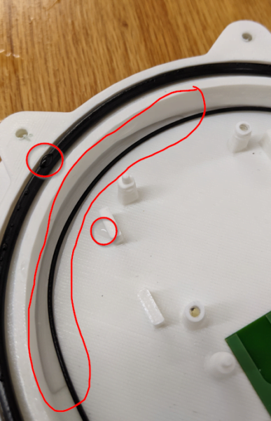 I started by spraying from mostly vertical angles, switching it up every now and then, for about 5 minutes. Then I opened up the case to check for moisture. I didn’t see any, so I closed it up again and went back to the sink. This time I sprayed from plenty of horizontal angles and probably managed to get some water in at a joint where one of the two cables passes over an o-ring (instead of using a proper cable gland). When I opened the enclosure there were plenty of signs of water entry, even on the seal itself.