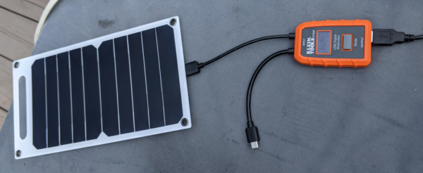 In order to measure both the power being generated by the solar panel and the power consumed by the circuits I used a USB power meter. If you plug a generating source in at once end and a consuming source at the other it will display the instantaneous power draw as well as integrate the total consumed electricity.